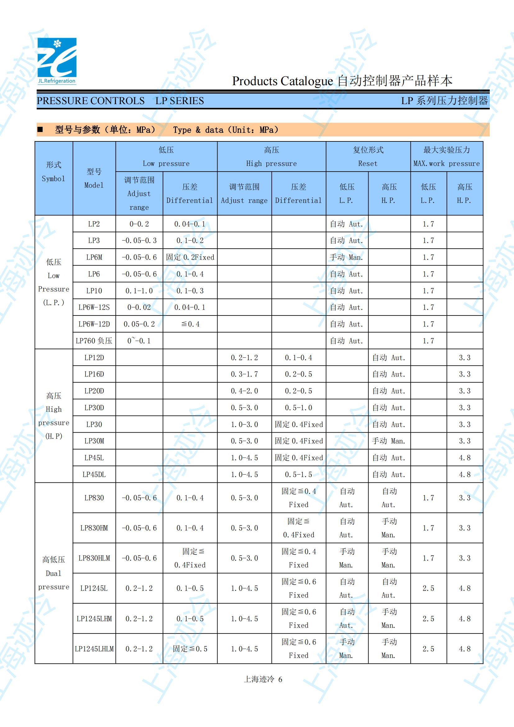 LP系列壓力控制(zhì)器(qì)用(yòng)于保護制(zhì)↓←冷(lěng)或空(kōng)調裝置的(¥ε€de)壓縮機(jī),使之免于吸氣壓力過低(dī)或排氣壓力過高(gāo)φ'≈♠。 LP系列壓力控制(zhì)器(qì)也(yě)可(kě)用(yònβλg)于停止壓縮機(jī)及空(kōng)氣冷(lěng)凝器←<§®(qì)的(de)風(fēng)扇。 LP系列壓力控制(zh♠♣↕♣ì)器(qì)還(hái)可(kě)以用(y<♥✘òng)于水(shuǐ)泵,消防,鍋爐,液壓π∞∞,熨燙,真空(kōng)等設備。 LP系列壓力控制(zhì)器(qì)有"©↕(yǒu)單刀(dāo)雙擲(SPDT)單刀(dāo)雙擲(DPST)雙刀(" dāo)雙擲(DPDT)三種形式的(de)切∑"§$換開(kāi)關,動作(zuò)值可(kě)根據需要(yào≤←₽)的(de)壓力來(lái)确定。 LP系列壓力控制(zhì)器(qì)★λ 配有(yǒu)銅質氣箱接頭,用(yòng)"↑↑于氨利昂制(zhì)冷(lěng)劑系統,也(yě)可(kě)以配不(bù)♠♦鏽鋼材質氣箱接頭,可(kě)滿足液氨等帶腐蝕性氣>±∏¥體(tǐ)或液壓系統。 LP系列壓力控制(zhì)器(qì)靈巧×φ€©的(de)微(wēi)動開(kāi)關結構确保了(le)可(kě)靠的(de)∏→'快(kuài)速轉換功能(néng)。 LP系列壓力控制(zhì)器(qì)&β認證:CE認證